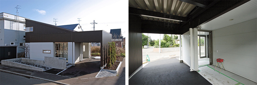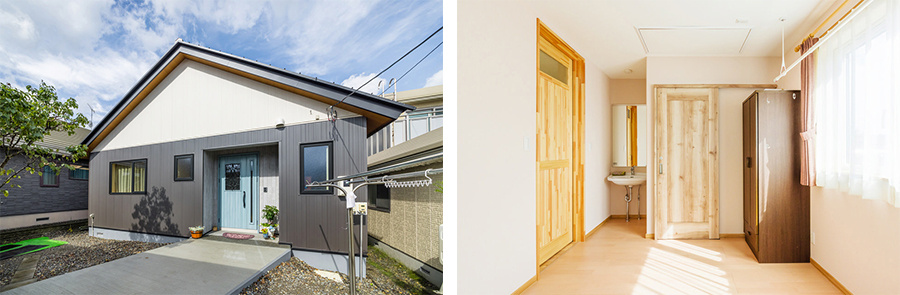 JR駅や幹線道路に近い住宅地に立つH邸は、60代の奥さまと70代のご主人が暮らす新居です。設計・施工したのは白石区の瀧本ホーム。ご夫婦が新築したのは、老後の「車イスの生活」を想定したバリアフリー住宅です。風除室の付いた玄関は、正面階段の付いた道路側と駐車スペースからアクセスしやすいスロープ専用の2か所を設けています。