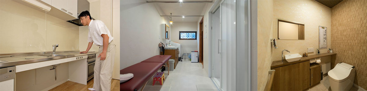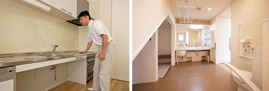 (有)奈良建築環境設計室 では、行き止まりのない8の字に回遊できる動線を提案、また道路まで段差なく行き来できる基礎の高さと床の高さを考えました。Nさんと一緒にショールームに行き、相談しながら設備類の選択や手すりの取り付け方を考えていったそうです。「キッチンなどは介護を前提にした商品がほとんどで、障がい者の自立生活を前提にしたものは皆無に近かった」とNさん。