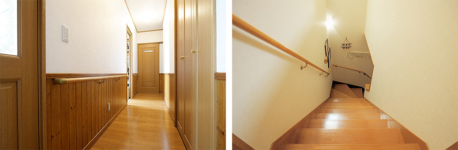 広々とした一階の廊下。ご両親の在宅介護をしやすいように幅広の廊下など、バリアフリーへの配慮も。腰壁には木を使い、落ち着きのある雰囲気です。階段も幅が広く、上り下りがしやすい段差になっています。