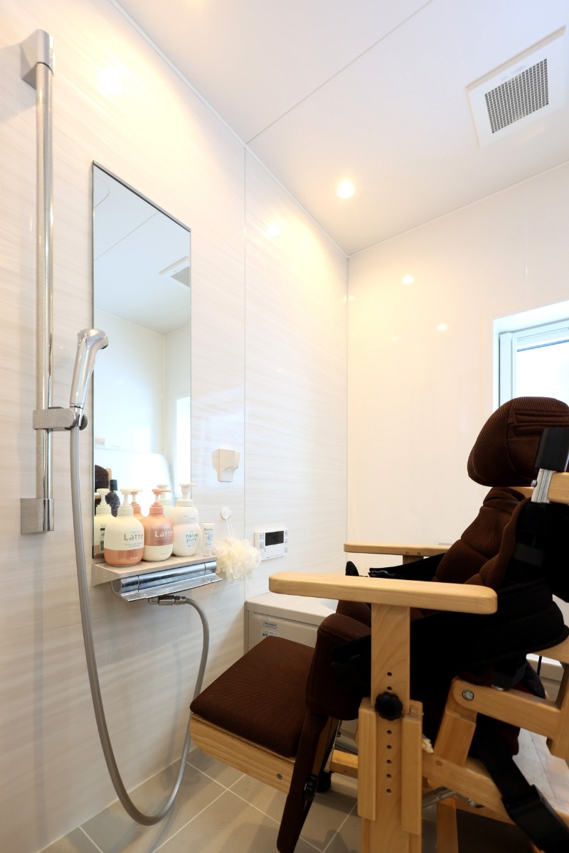 通常は鏡の右側に付けられるシャワー・スライドバーを左に配置。空いた鏡の右側壁面は、将来的に入浴用の介護リフトが設置できるよう、下地を補強してあります。
