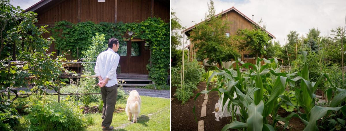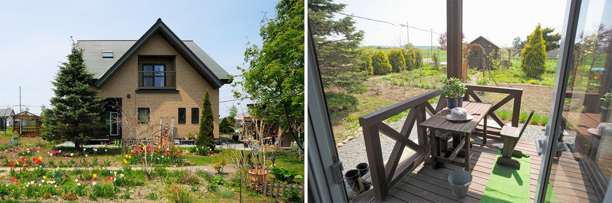 キッチン横にあるドアを出るとそこには木製のバルコニーとテーブルが。菜園で収穫された新鮮なお野菜が、朝の食卓に並びます。「東川町での暮らしに不満は全くありません。庭は当初はイングリッシュガーデン風を考えていましたが、広い庭に好きなものを植えるうちに自然いっぱいのホッとする庭になりました。家庭菜園も楽しくて贅沢な生活かなと思います」と笑顔がこぼれます。