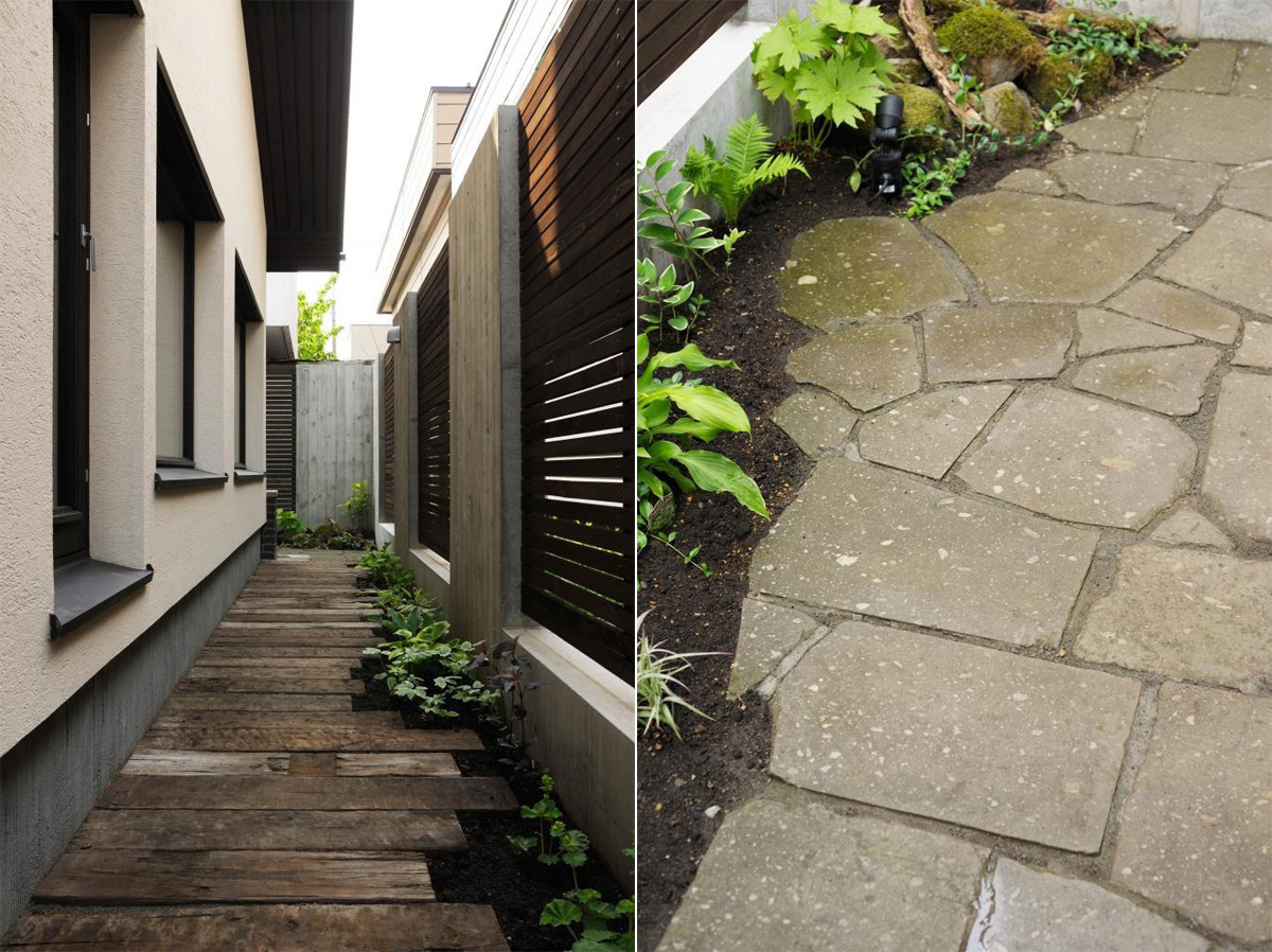 このモデルハウスは市街地の50坪ほどの敷地に建っています。都市型で利便性も良い暮らしを望む場合は、敷地面積が狭く隣家とも近い、駐車スペースも家族用、来客用の2台分が必要となるなど制約が増えます。でも、例えば約1㍍の空間を、枕木や植栽などで演出するなど、狭い空間も上手に活かしたいろいろな工夫が可能です。札幌軟石や植栽、苔類などを使い狭い空間でも自然を感じる空間を演出できます。