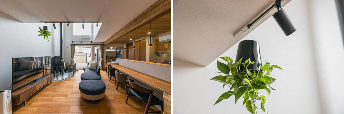 天井近くに飾ってある観葉植物は、照明用のレールに「スカイプランター」と呼ばれる逆さにしても土のこぼれない植木鉢を吊り下げたもの。空間を活用でき、小さいお子さんのいるお家でも安心です。