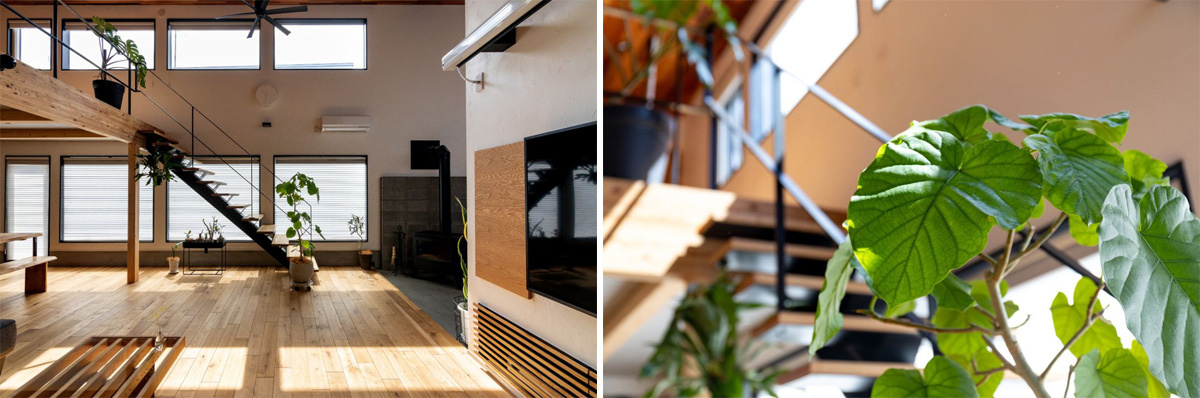 観葉植物は奥さまの趣味。日々、丁寧に育てています。奥様は植物にもこだわり、「日がたくさん入って、とにかく開放的に」とオーダー。薪ストーブ効果もあり、初めての冬も葉をあまり落とさず元気でした。