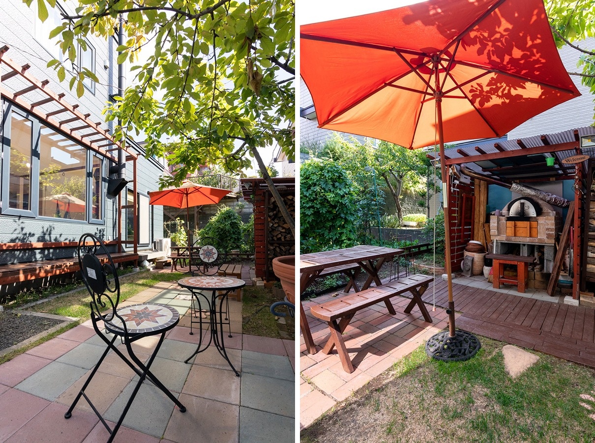 20年かけて完成したおしゃれな庭。左の写真は、サクランボの木の下に配したテラスセット。右の写真はNさん手作りのピザ窯です。
