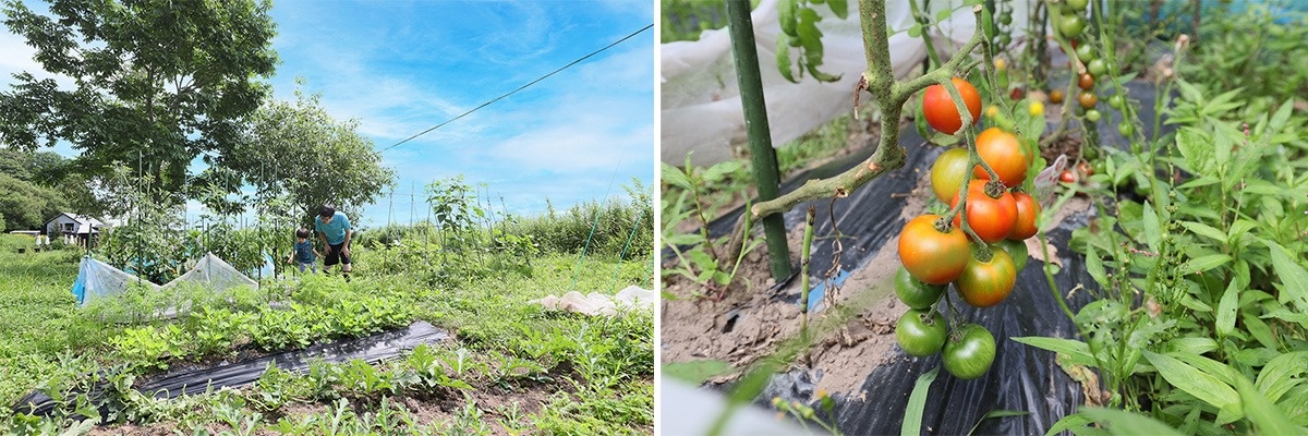 ・広い畑に自給自足ができるほどのたくさんの野菜を育てる