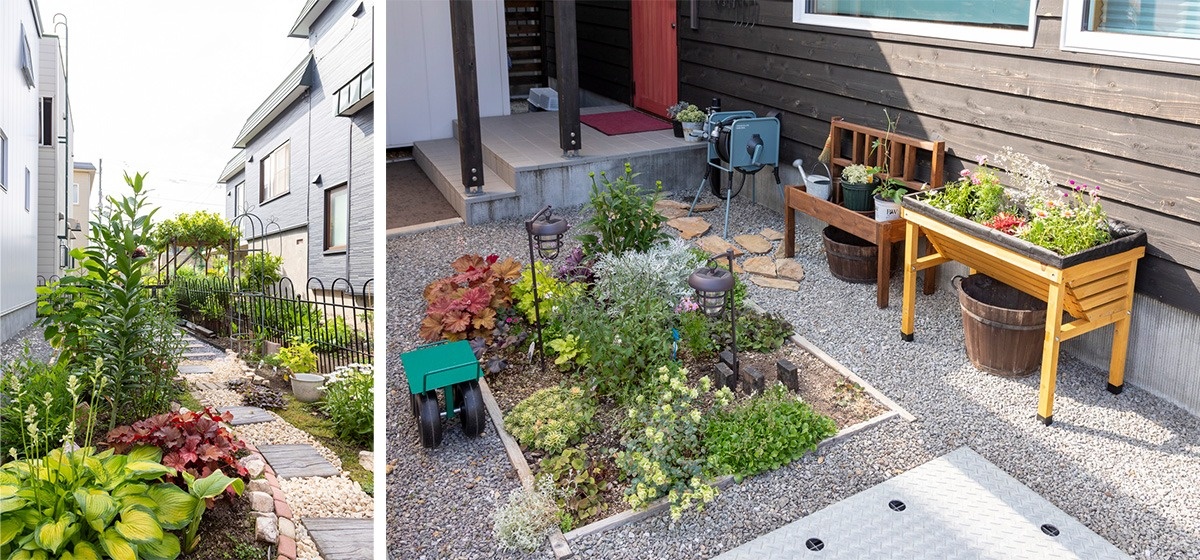 玄関横をはじめ、カーポートの横や裏庭も素敵にガーデニングをしているのはお母さん。以前暮らしていた家も比較的街中にある一戸建てで、その時はロードヒーティングを採用していたそう。