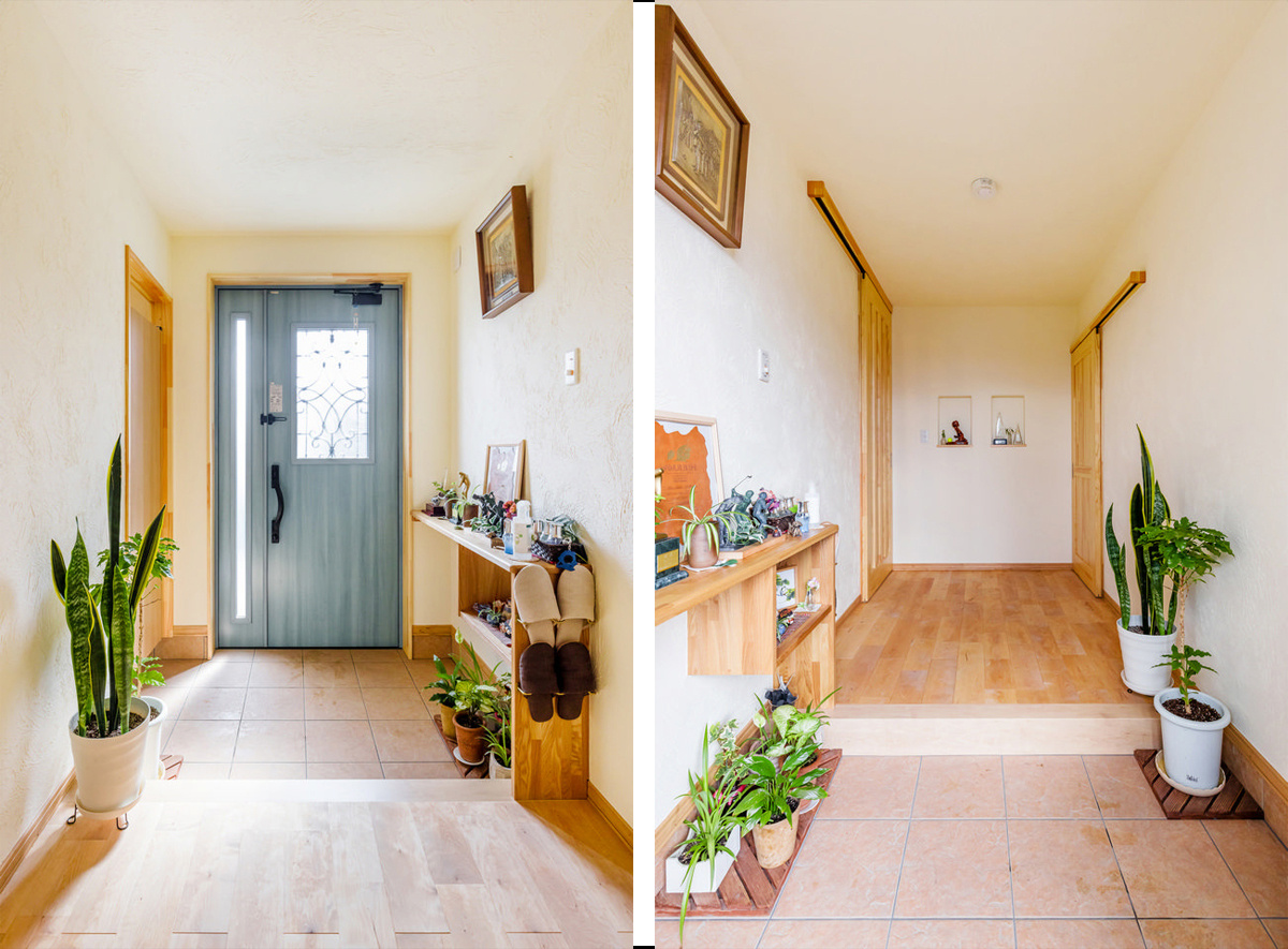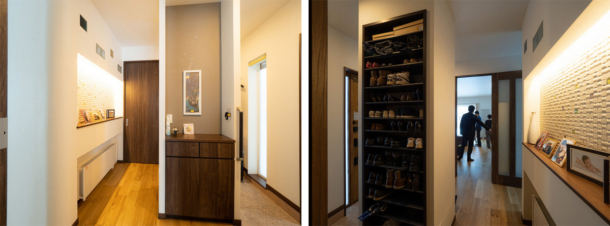 「お客様を気持ちよくお迎えできる”エントランス” を作りたかった」と、玄関はホールがふたつある造りにしました。家族用玄関(写真右側)はあえて扉やカーテンで仕切らず、生活感を隠しつつも奥行きを感じさせる空間使いです。