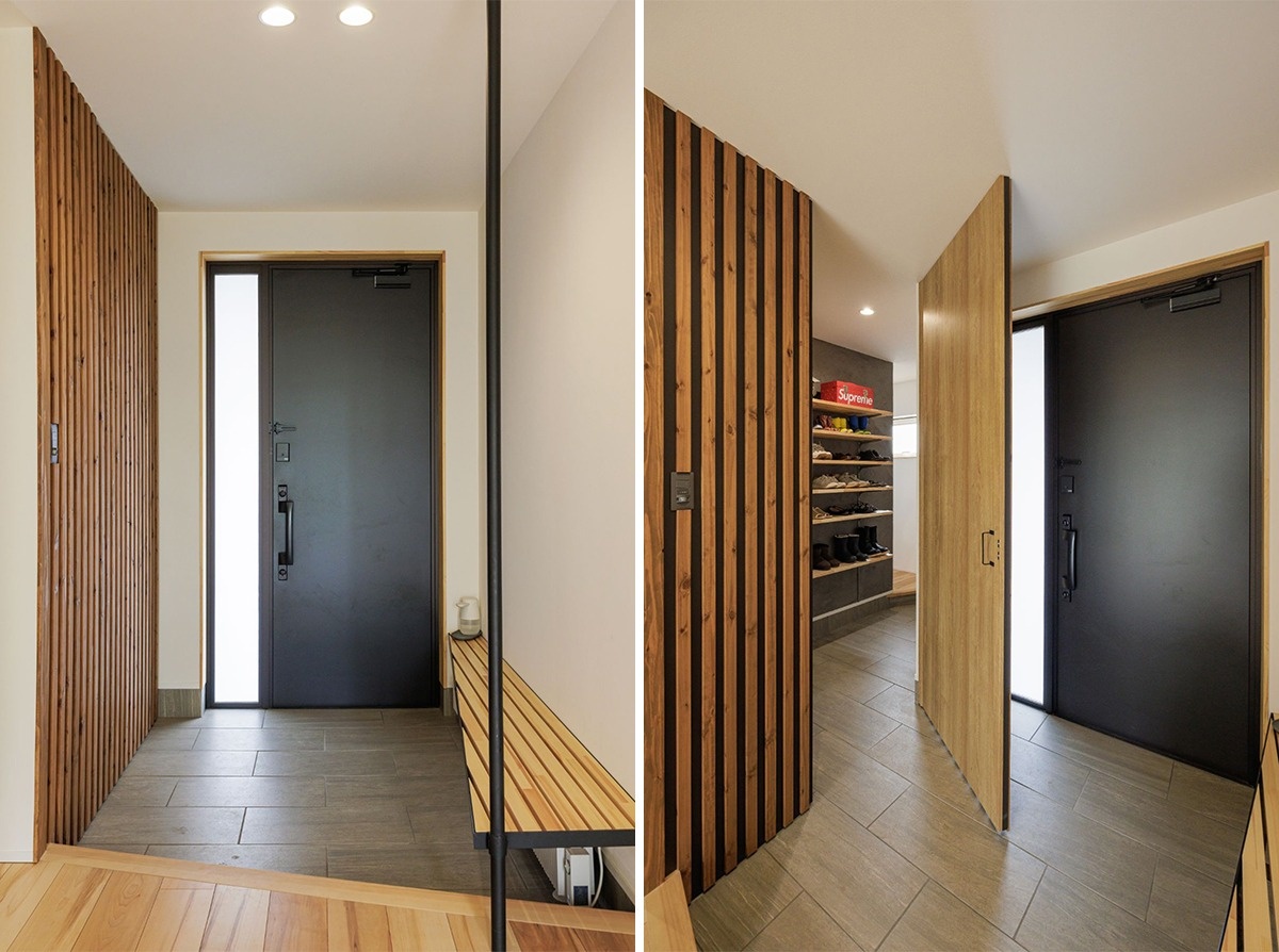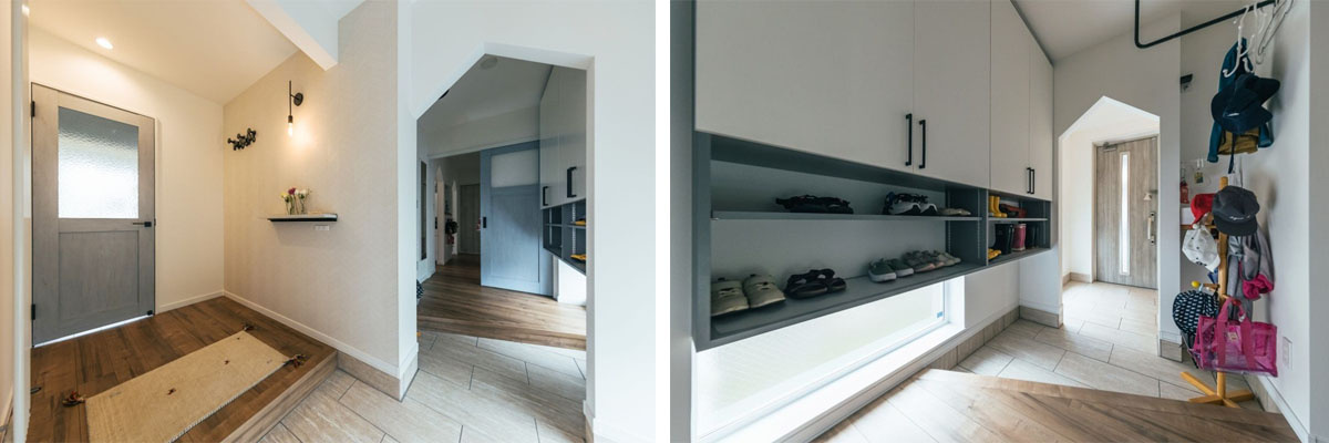 写真左はシューズクローク。黒、グレー、木と、外観とマッチした配色になっています。