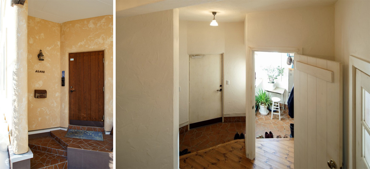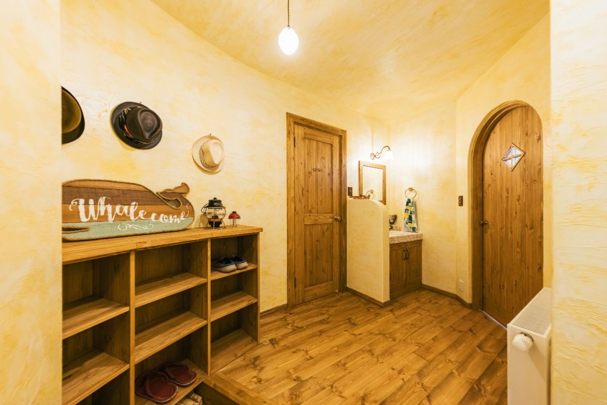 木製ドアや塗り壁、自然な形状に組み合わせた床タイルなど、玄関まわりのこだわり。玄関に入ると1階はご両親の居住スペース。2階は朝日社長とご家族のスペースに分かれる玄関ホール。左右に靴や衣類などを収納できるクロークがあります。