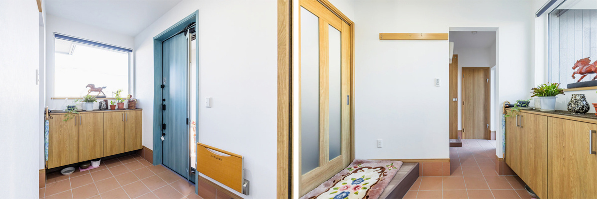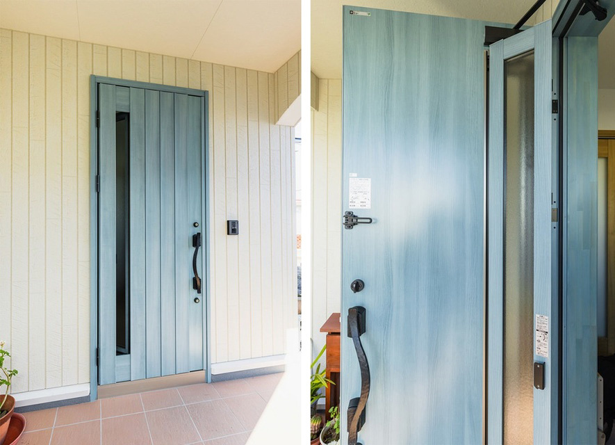 ペールブルーの親子扉が印象的な玄関ドア。「光が入り、明るいので、窓付きの玄関ドアにしてよかったです」と奥さま。玄関横にはシューズルームも設けています。棚を作った収納力抜群のシューズルームには、ご主人が趣味で楽しまれているゴルフの道具も収まっています。