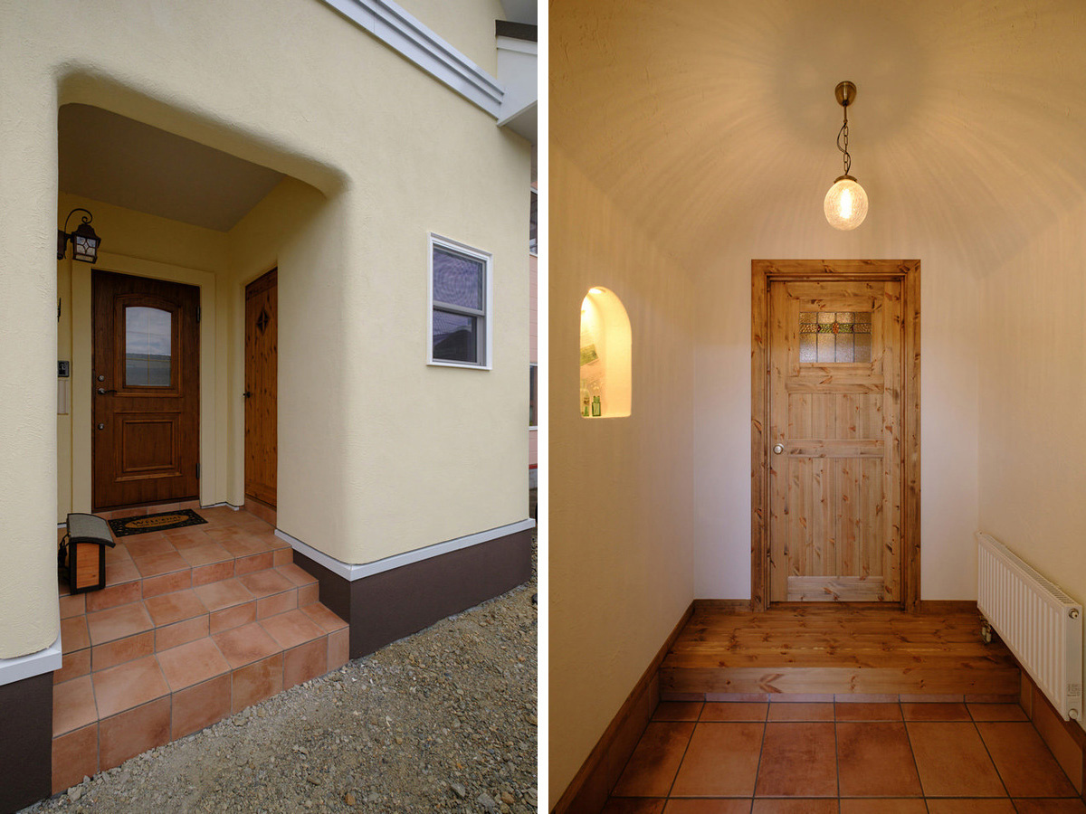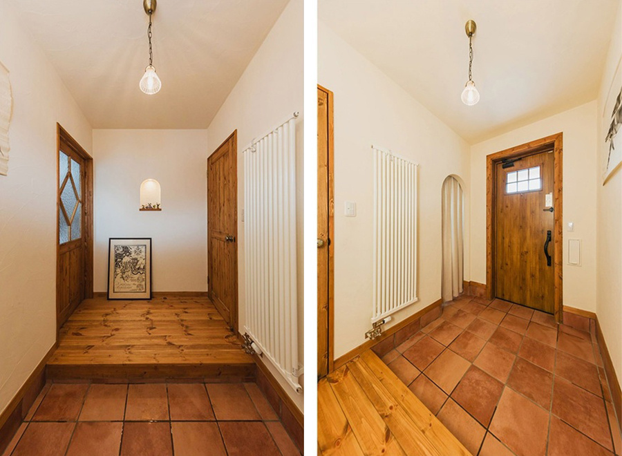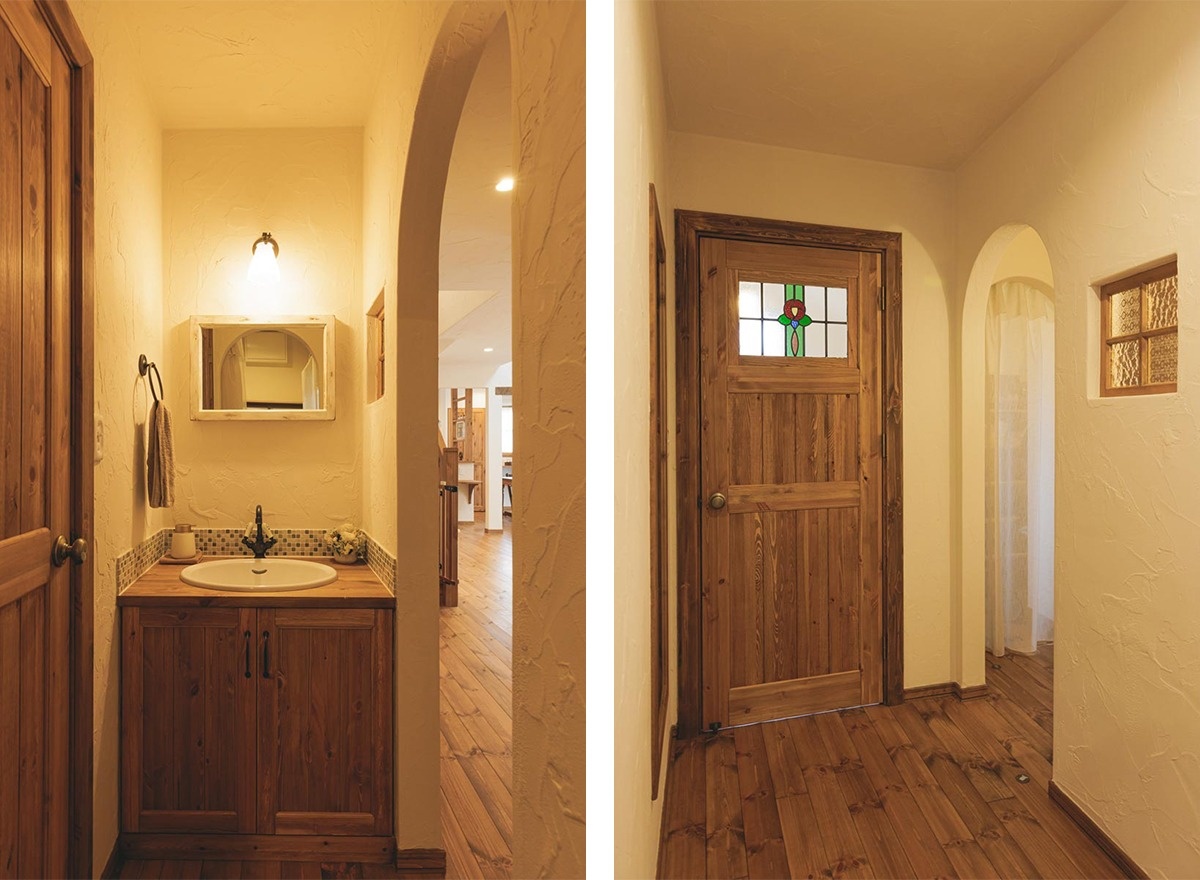 玄関を入るとまず迎えてくれるのがテラコッタ調の床タイルです。無垢材の床、天然木のドアと少しずつ深くなる茶系の色味に、温かく奥へと誘われるような感覚を覚えます。印象的なふたつのアーチは、施工を担当したウッドライフの得意なスタイル。間に作られたニッチがアンティークな雰囲気です。