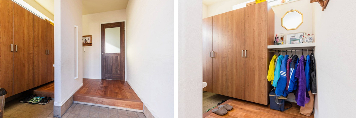 扉付きの大型シューズクロークのある玄関ホール。玄関を広く見せるためシューズクロークとホールを完全に仕切らず、ホール中央の間仕切りでお客様のスペースと家族のスペースを分ける形にしました。