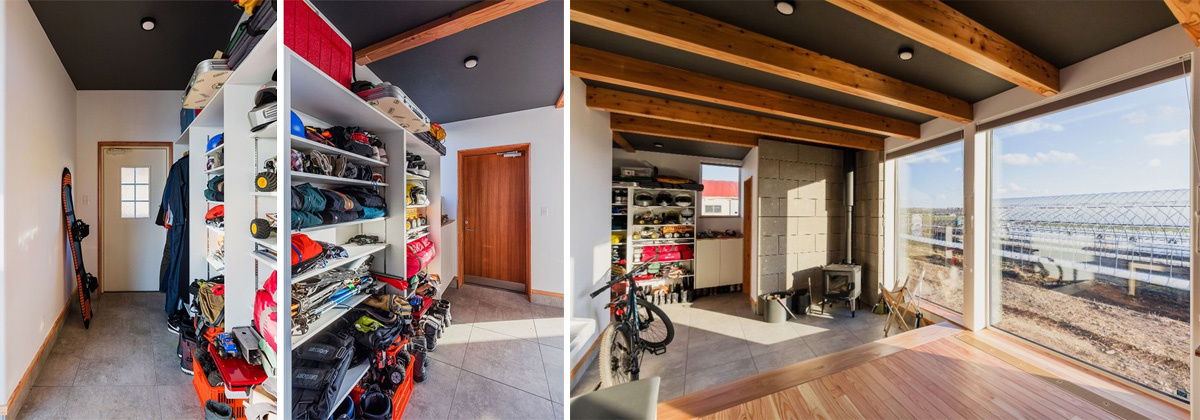 農作業着のまま入れる裏玄関(写真左)とカウンターの設置された表玄関(写真中央)。玄関はそのまま広々とした土間に続いています。大容量の棚に収納されているのは、キャンプ用品やヘルメットなどアウトドア好きというご主人の趣味のアイテムたちです。居室部分から緩やかに区切られた土間に設置したことで、単なる収納ではなく“基地”感のある趣味のコーナーとなりました。