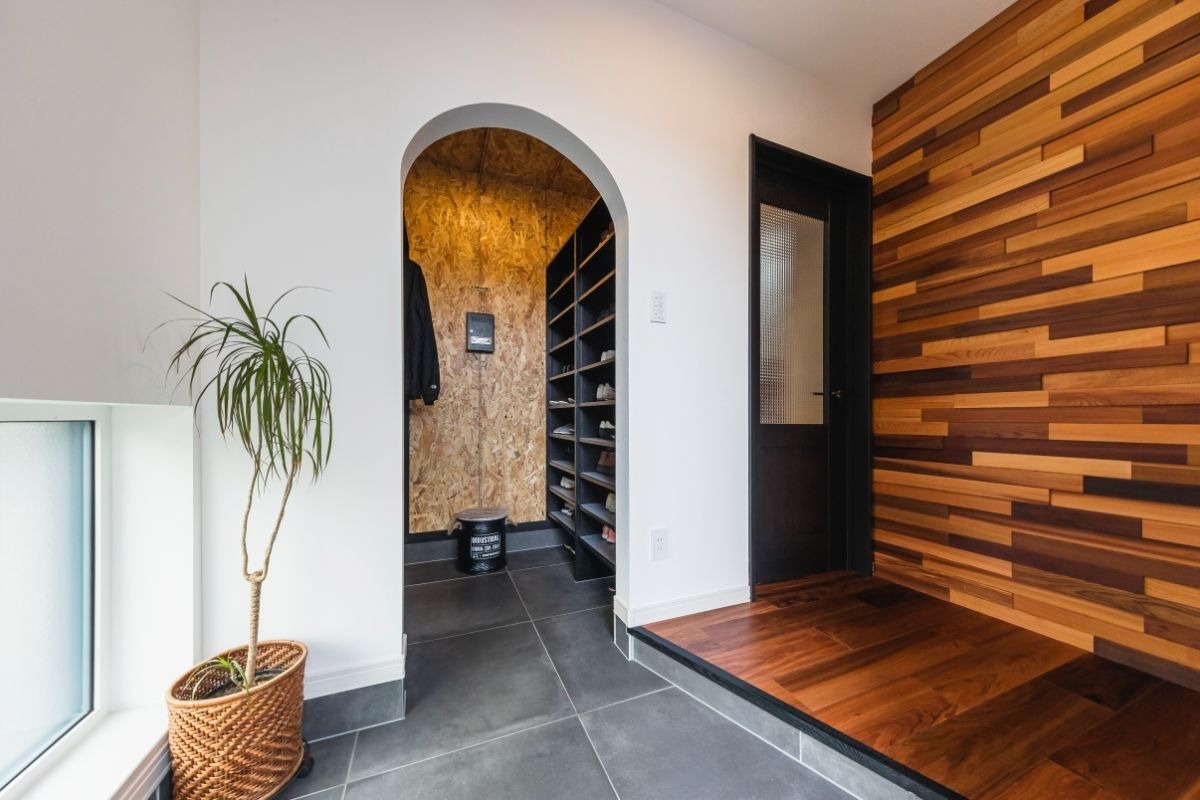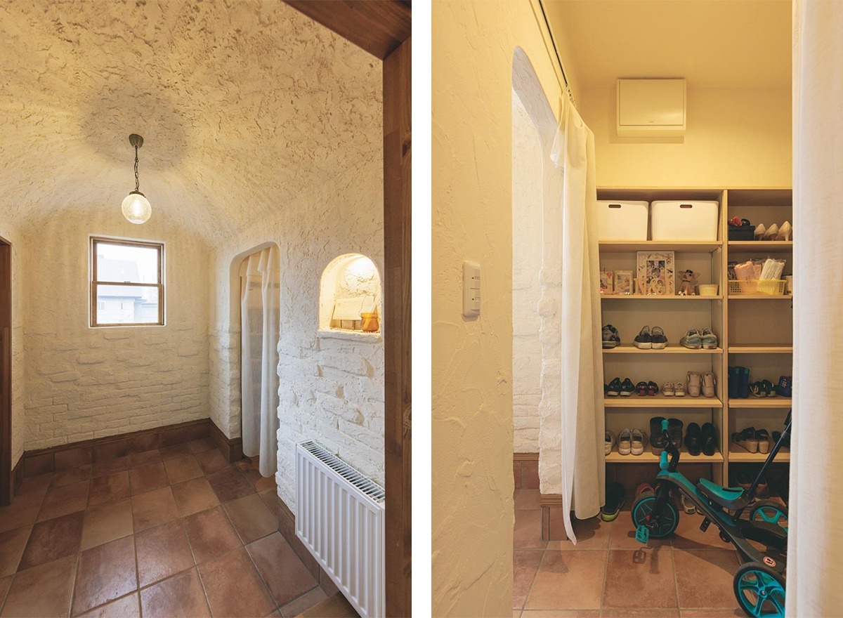 玄関ホールはペンダントライトの照明がアーチ状の天井に反射して幻想的な模様を写し出しています。塗り壁は、玄関ホールはあえてコテむらを活かしているのに対し、室内はローラーで凹凸を抑え、繊細なイメージに仕上げています。玄関ホールの右側にはシューズクロークもあって十分な収納力を確保しています。