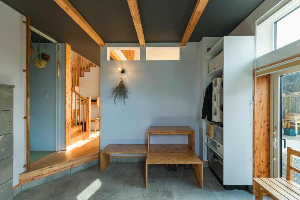 玄関は広々とした土間空間。写真左手前には薪ストーブを設置し、玄関という役割を超えたくつろぎの場となっています。