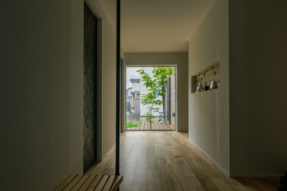玄関から入るとすぐに視線が庭へ抜け、シンボルツリーが目に入るようになっています。「ここの場所のイメージから家づくりが始まりました」(ご主人)というのがこちらの廊下兼エントランスです。