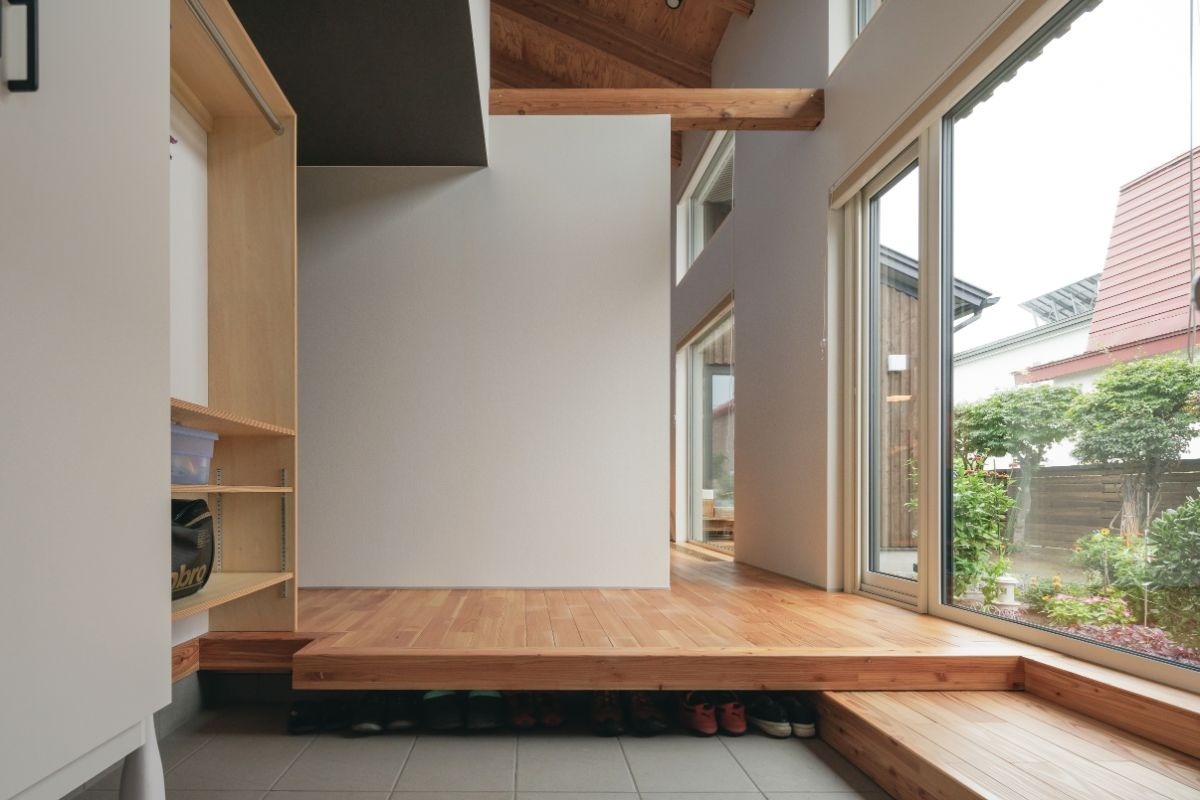 大きな窓があり明るい玄関。玄関の床とフローリングの間には段を設け、家族全員が上がりやすいデザインになっています。