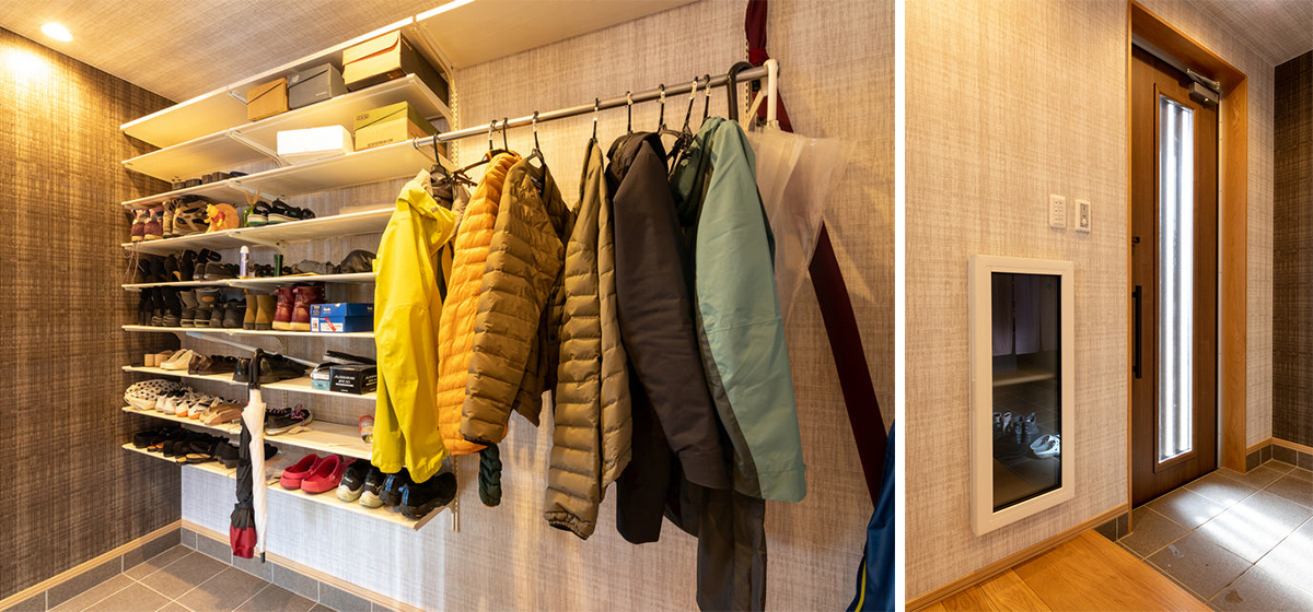 玄関には、外で身につけていた服や物を室内に持ち込まないで済むように、コートやスーツなどをすべて収納できるシューズクローゼットを作りました。キツネのクロスも可愛らしいポイントになっています。