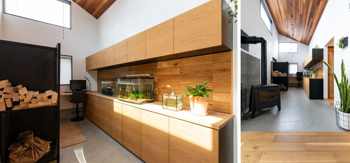玄関近くの長い収納棚には水槽や観葉植物が置かれ、趣味のスペースも兼ねています。写真奥のカウンターでは、大工仕事で必要な書類チェックなどが玄関先ですぐできます。