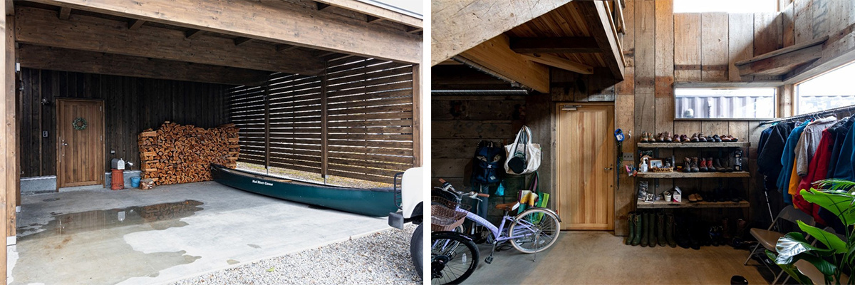 玄関廻りにはカヌーや薪が置かれています。玄関ドアを開けると、広い土間が。自転車や衣類、靴が置かれています。建物は「山小屋」をイメージしただけあって、アウトドア感が漂います。