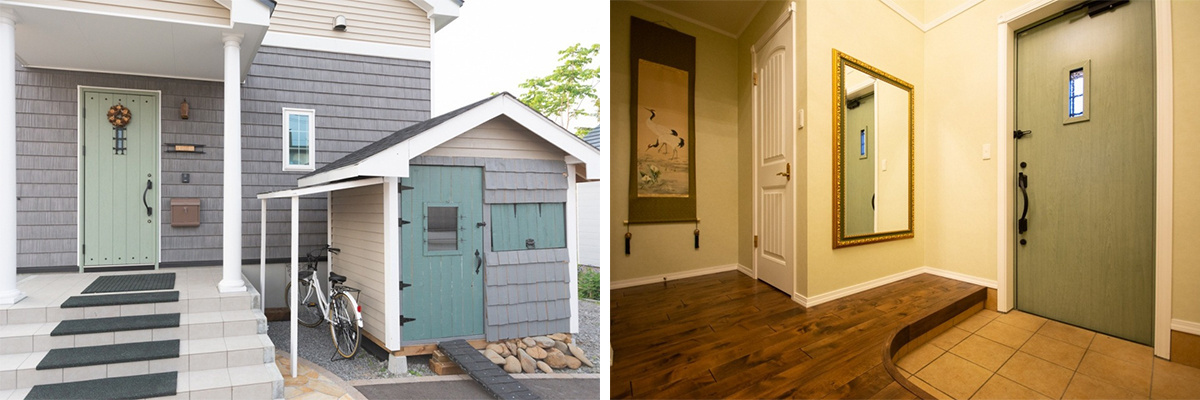 淡いグリーンのドアやクロスでコーディネートされたエントランスホール 旭川市旭岡・T邸/セルコホーム旭川・小森工務店