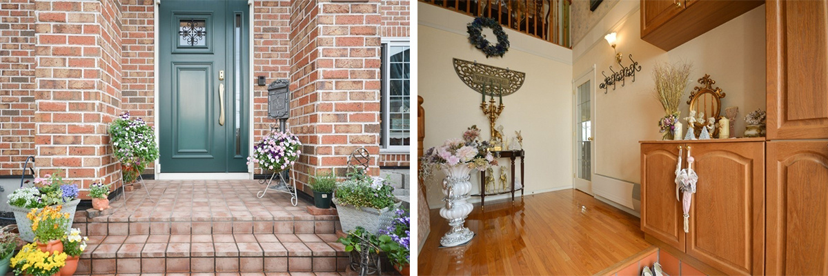 旭川市豊岡にその住宅はありました。植栽、レンガの外壁、玄関ドアの色合いが美しいですね。木と白い壁を基調とした内装に、キャンドルスタンドやフラワーベースなど調度品も似合います。