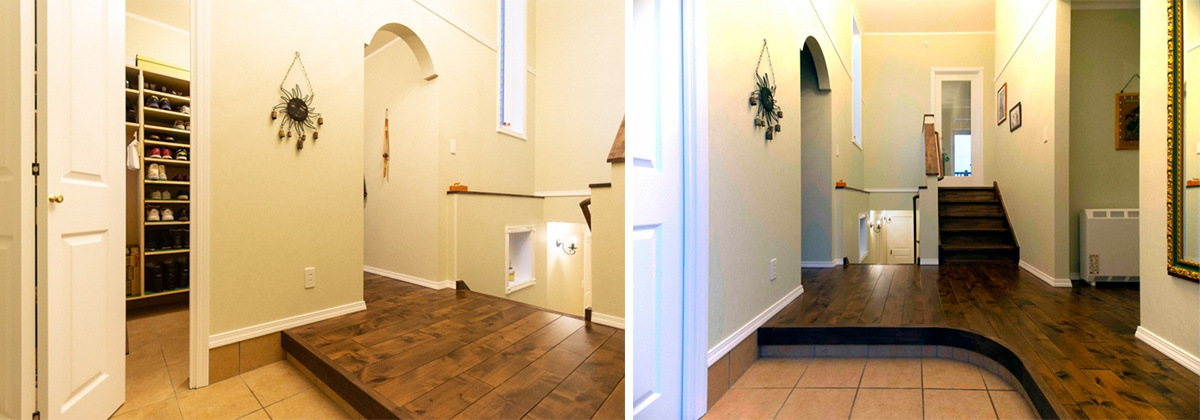 Sさんご夫妻の要望が最も多く反映された広い玄関ホール。ナラ・タモ・ウォルナット・チェリー・メープル・チークの6種類の木を使用したウッドタイル貼りの間仕切りで来客用とプライベートスペースを分けています。