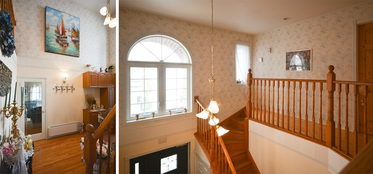玄関ホールは吹き抜けになっていて、大きな絵画が飾られていました。吹き抜けにはハーフサイクルウインドウ(半円の窓)の採光窓も。輸入住宅の定番アイテムです。来客は、外観と開放感いっぱいの吹き抜け玄関、豪華な階段などを目にするだけで、この家の魅力に気付くと思います。