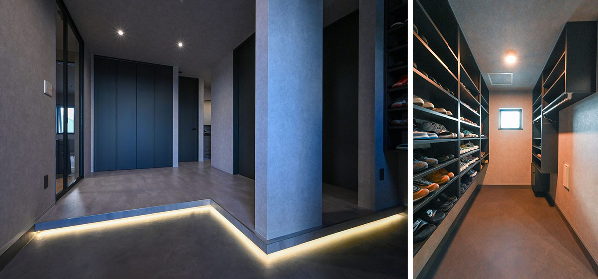 間接照明のモダンな玄関の上がり框(かまち)と収納力抜群のシューズクローゼット 稚内Y邸/小山内建設