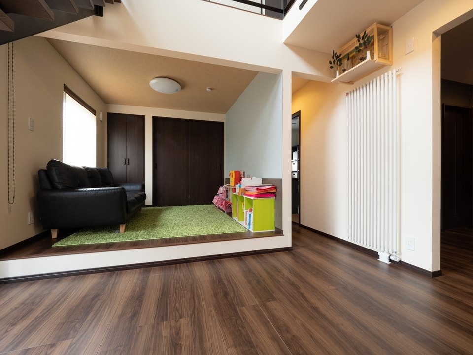 リビングの一角にある小上がりは、Sさんたっての希望で造られました。間取りや仕様が決定した最終段階でしたが、「やっぱり畳でくつろげる空間がほしい」と、最後の最後に変更しました。