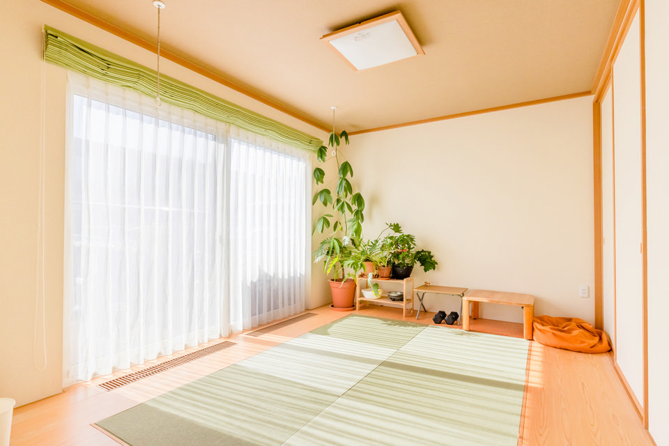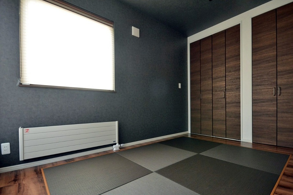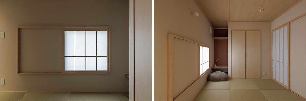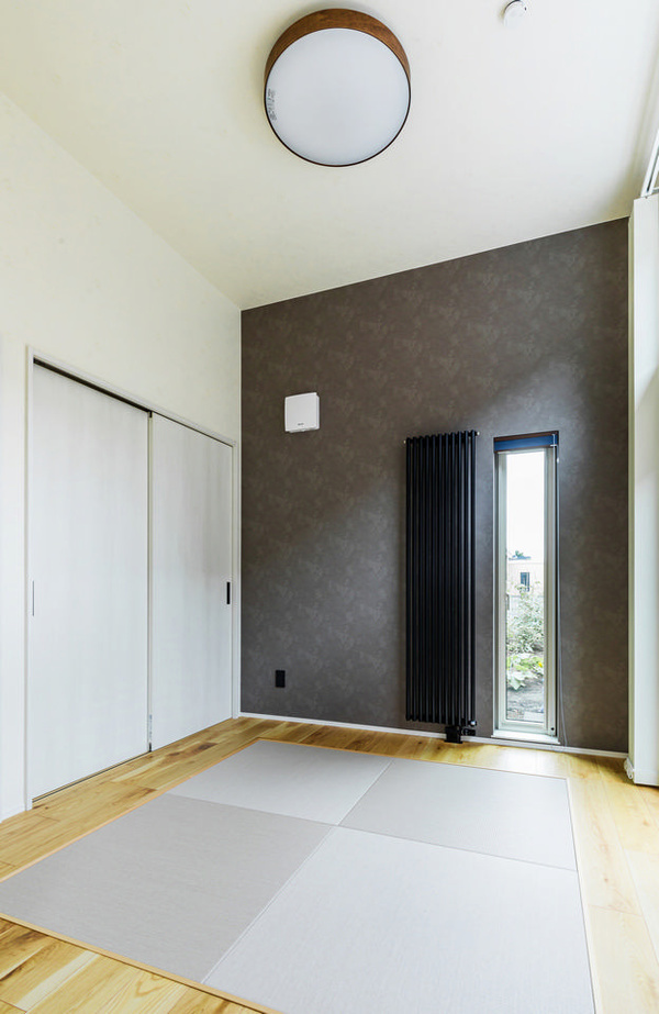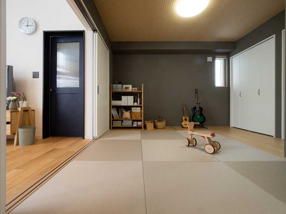 和室は、い草の匂いが苦手だったため、和紙でできた畳を採用。ふすまも洋風にして和室感を減らしました。