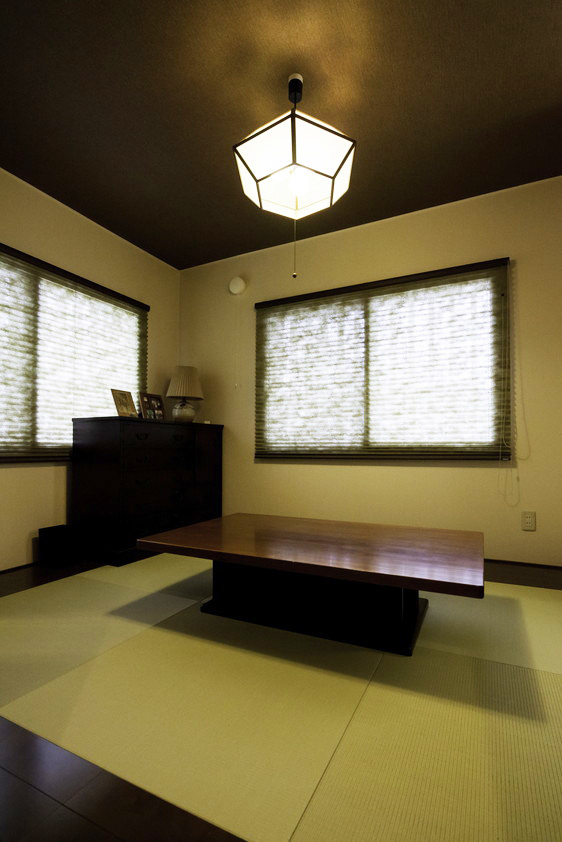 リビング横には、「実家にあったような畳スペースがほしかった」(奥さま)ことから小上がりの和室をつくりました。お客さまが来た時には泊まってもらう予定。奥さまがセレクトした和モダンな照明によって、和風旅館のような雰囲気です。