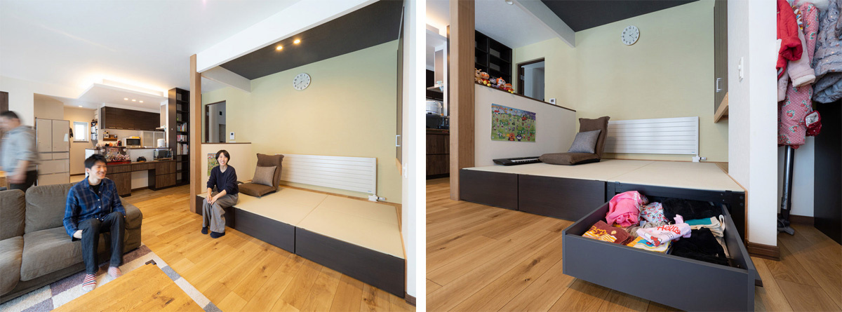 小上がりの下は石井さんの提案による引き出し式の収納があり、お子さんの衣類など、すぐ取り出したいアイテムを収納するのに重宝しています。