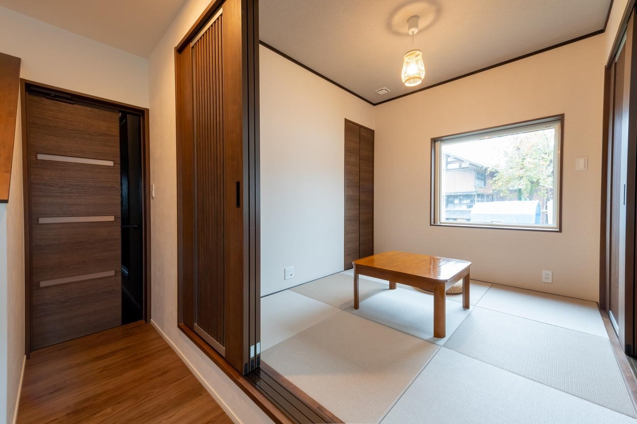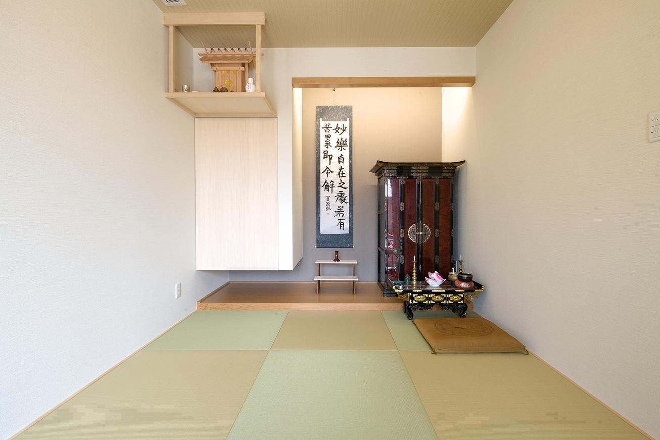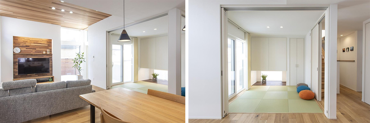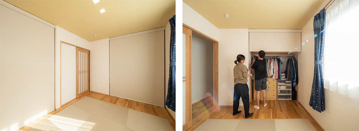 和室の壁や天井を日本的な色使いとすることで、リビングとの一体感を残しつつ和の風情を演出しています。クローゼットの扉を外せば仏間として使えるなど、ライフステージの変化に対応した造りです。