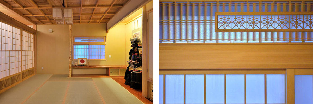 外城常務と奥さまの未来さんは、2人とも北米に留学した経験があります。そこで発見したのは日本の良さ。奥さまは、「アメリカに行って和服の良さ、奥深さに気づきました。今は着物を着るのが大好きです。だから和室は欲しかったし、せっかくだから雪見障子も欲しかった」と言います。フチなし畳もおしゃれ。