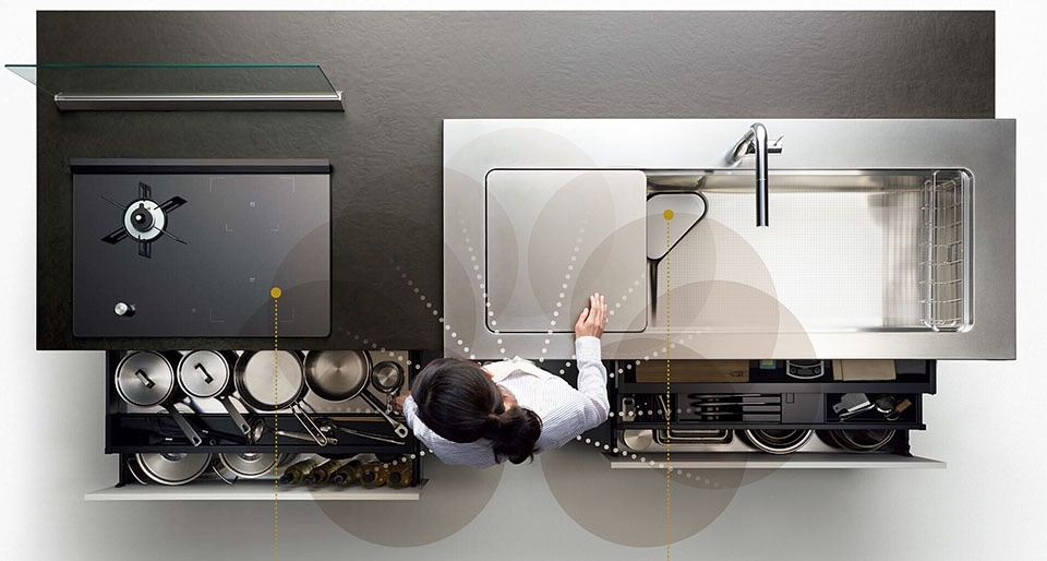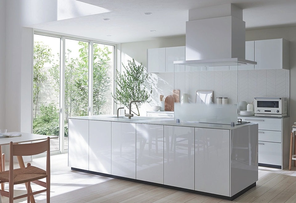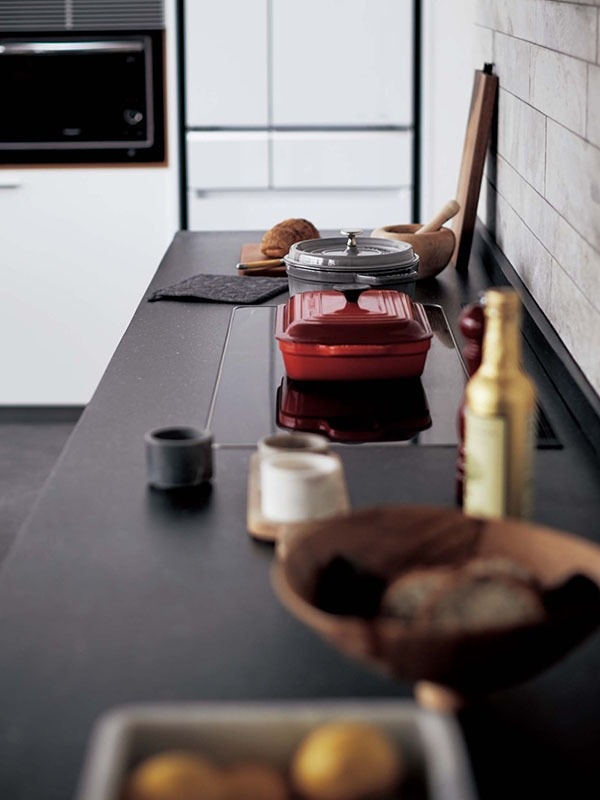 コンロを3つ横並びにすることで狭くなる調理スペースを、あまり意識しなかったコンロ手前の16cmの奥行きで補う発想で、狭い間口でも機能的なキッチンになります。人気の「フロート型デザイン」のキッチンも、日本ではパナソニックのLクラスに採用されています。床とキッチンキャビネットの間が空いている洗練されたデザインと、機能性が上質なリビングキッチンをつくっています。
