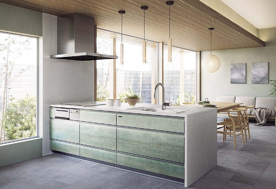 ワークトップ、扉デザインともに選択肢が豊富なのも特徴。ワークトップは、ステンレス、人工大理石のアクリストン、スペイン社製のセラミックと合計20種類から選べる。扉デザインは40種類あり、職人が手作業で仕上げる京友禅調デザインやステンレスに加工を施して虎目石調に仕上げたもの、ウォールナット突板仕上げなど幅広いバリエーションがある。