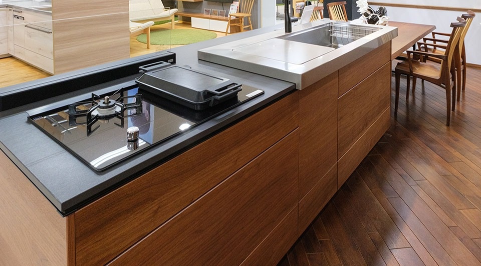 調理設備では、トリプルワイドIH、トリプルワイドガスが売り。魚焼きグリルを廃し、3つのコンロを真横に並べる斬新なレイアウト。コンロの位置が奥まったことで、レンジフードも奥に移動し、背の高い人がコンロの前に立ってもレンジフードに頭をぶつけにくい。