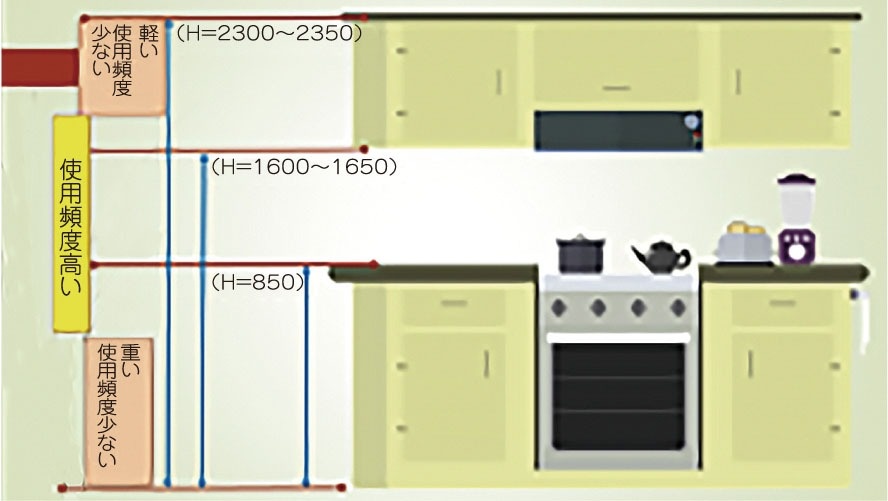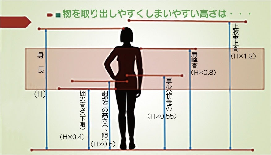また、キッチンで人が無理なく作業できる高さの範 囲は『身長×0.4(下限)~0.8(上限)』とされる。頭上の食器棚の位置やよく使用する調理家電の配置などを決める際に参考にすると、使いやすいキッチンにぐっと近づける。