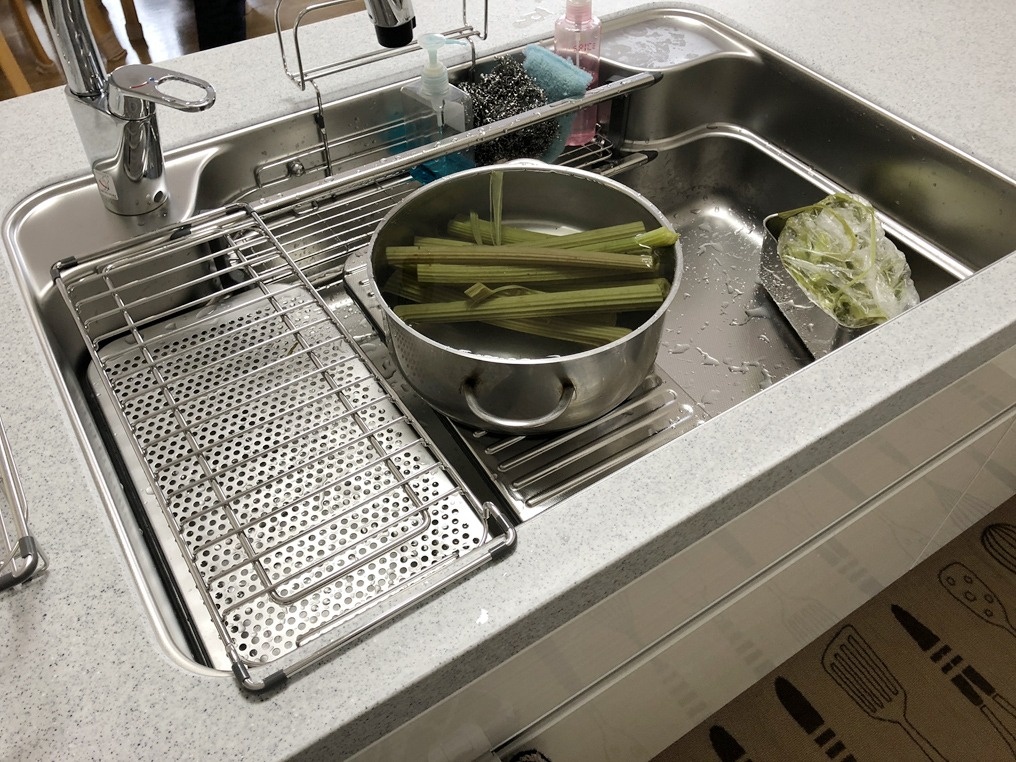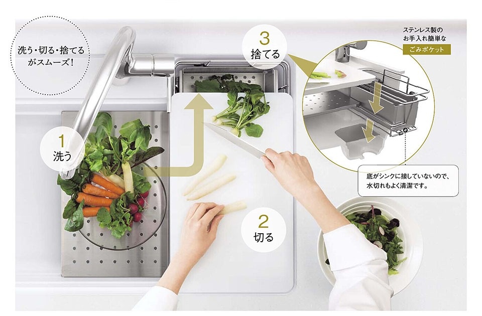 このほか、「家事らくシンク」は、3層の溝があり、専用の水切りプレートやまな板などをセットすることで、洗う→切る→捨てるの一連の動作をシンクの上で行える。後片付けや清掃も楽になり、動線に無駄がない。
