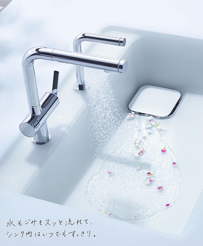 TOTO(株)の「ザ・クラッソ」は、透明感ある「クリスタルカウンター」のイメージが強い。耐光性や耐熱性を向上させたハイブリッドエポキシ樹脂からできている。ガラスのような透明さと、360度に加熱した鍋底を20分置いても変色や膨れなどの異常がなかったという耐熱性、擦り傷をクレンザーで磨いて落とせる堅牢性が売り。さらにザ・クラッソは「スクエアすべり台シンク」や、高い位置から幅広のシャワーが出てくる「ほうき水栓」が採用可能。マイ水筒を持参する人が増える中、水筒を立てて洗いやすい。このほか、安全な濃度の次亜塩素酸水を作る「きれい除菌水」機能で、まな板や包丁、網かごを除菌できるのも魅力。