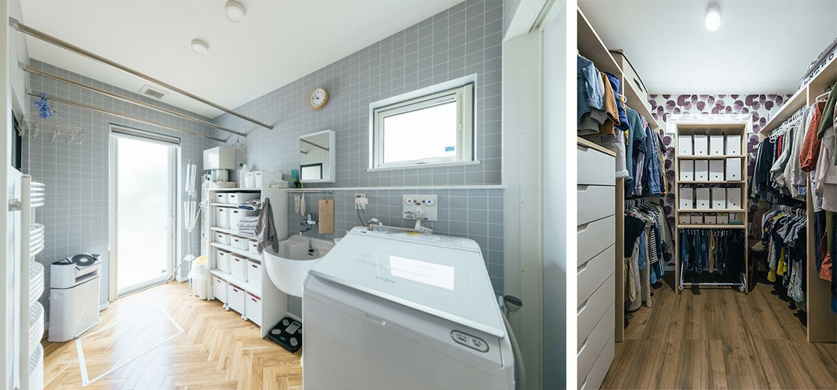 「この家は洗濯機から乾燥室、そして外の物干しスペースまでが一直線。ファミリークローゼットも二階ではなく、洗濯動線上に作ったので移動が苦でなく、家事が楽しくなりました」(奥様)。クローゼットの位置も重要なポイントのようです。