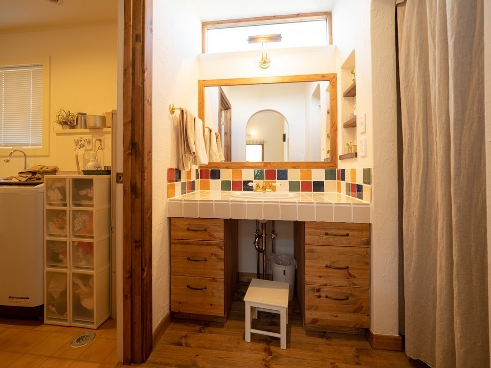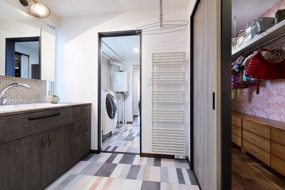 そこで生まれたのが、このプラン。カラフルなタイル張りの洗面スペースを中心に、左隣にお子さまの靴などを洗うスロップシンク付きのユーティリティ兼洗濯室、右隣のカーテンを開けると家族全員の衣類をらくらく収納できるファミリークローゼットが一直線に並びます。