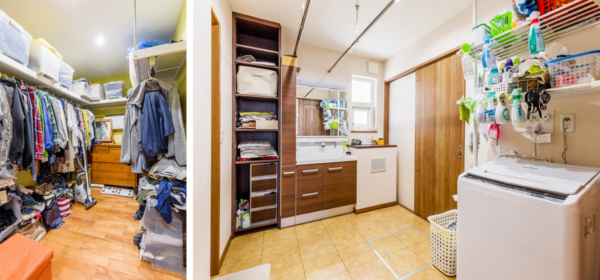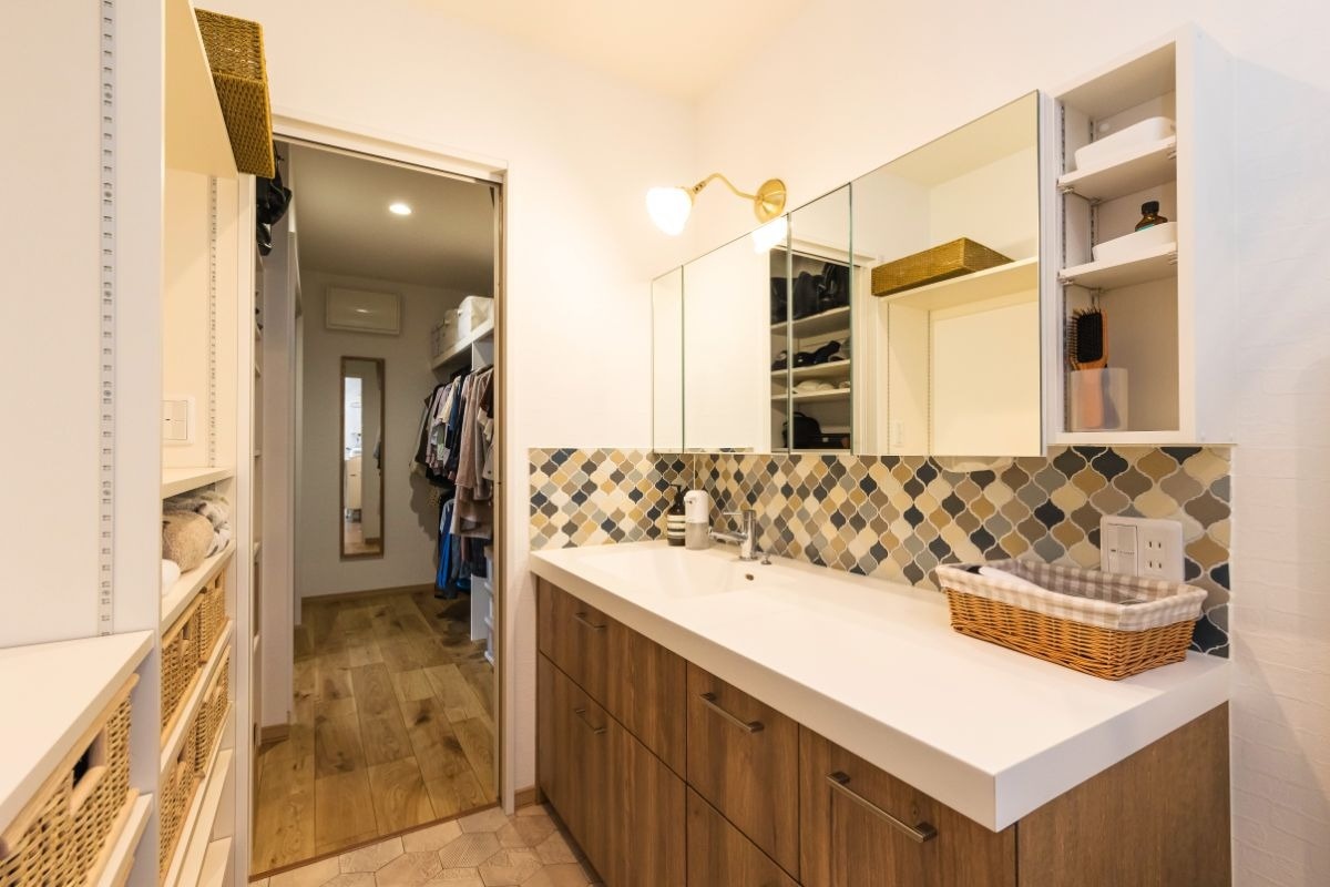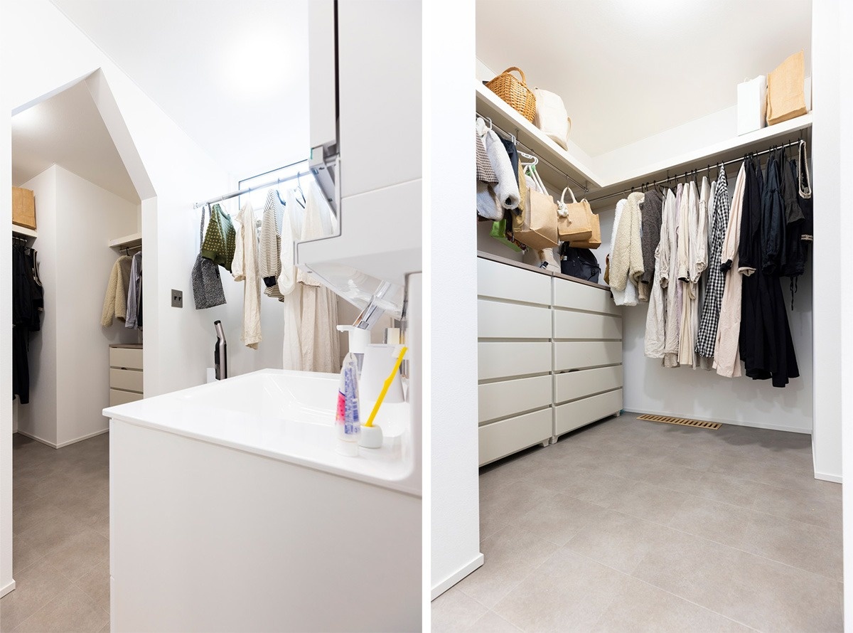 洗面所兼脱衣所には収納がたっぷり。水回り用品やタオルのほか下着なども収められています。すぐ奥にはファミリークローゼットを配置、入浴後の着替えや洗濯後の片付けがスムーズな間取りです。