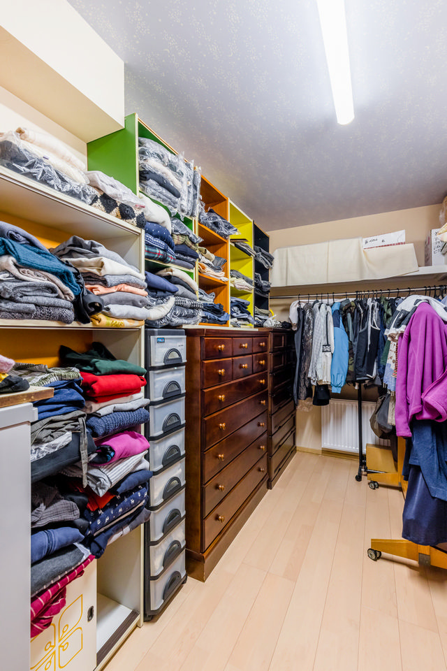 ウォークインクローゼットの広さは7畳以上。内部は手持ちのタンスや収納ラックなどが収まり、美しく整頓されています。