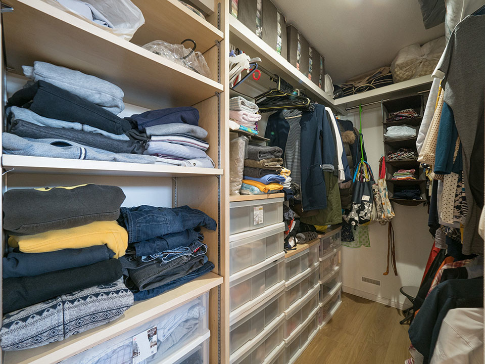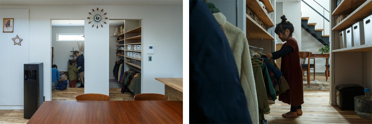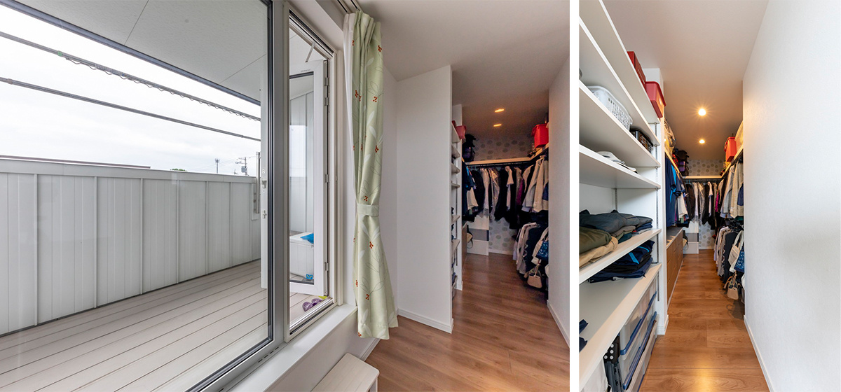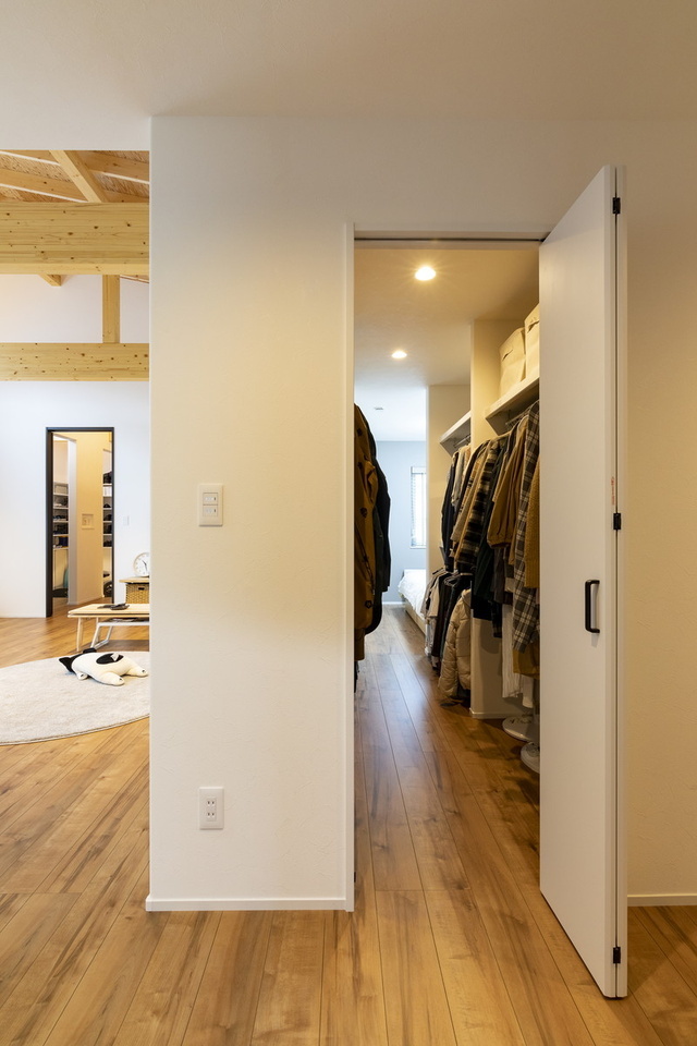 リビングから出入りできるウォークインクローゼットは、L字型の回遊式。帰宅後すぐに部屋着に着替える習慣があるKさん家族の暮らしに合わせ、リビングとダイレクトな動線を提案しています。