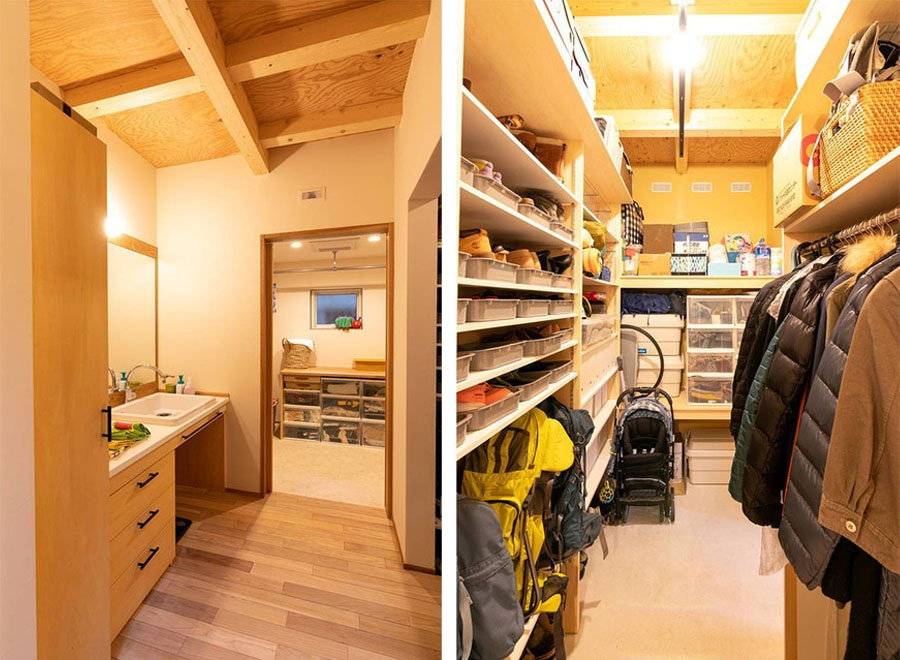 こちらのK邸、間取りは農家さん向けの住居を研究して決めたのだそう。キッチン・洗濯スペース・洗面脱衣室・風呂場と水回りは一直線になっており、農作業着用洗濯機やシンクのある裏玄関へもスムーズに移動できる造りです。
