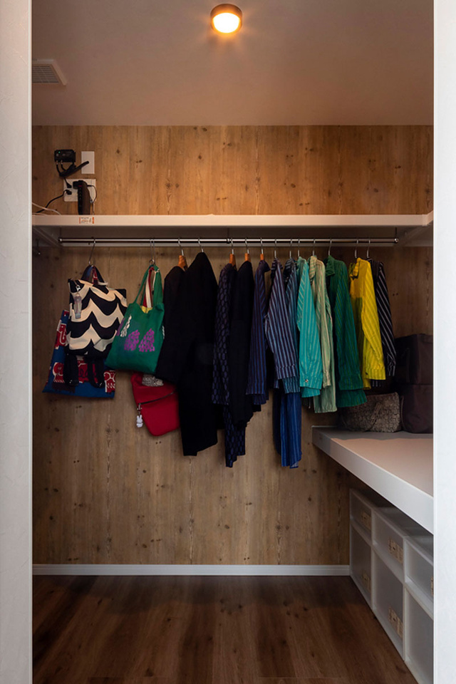 玄関ホールと洗面室の両方から出入りできるファミリークローゼットはKさんご夫婦の希望でした。家族全員の衣類が収納されています。