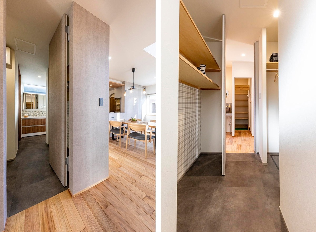 壁を押すと、実は扉になっており、中はファミリークローゼットになっています。玄関から一直線に続き、帰宅してすぐ部屋着に着替えることができる、まさに「ただいま動線」です。あえて家の中心に配置したことで家族にとっては使いやすく、そこに収納があると感じさせない壁と一体化したドアでもポイントです。
